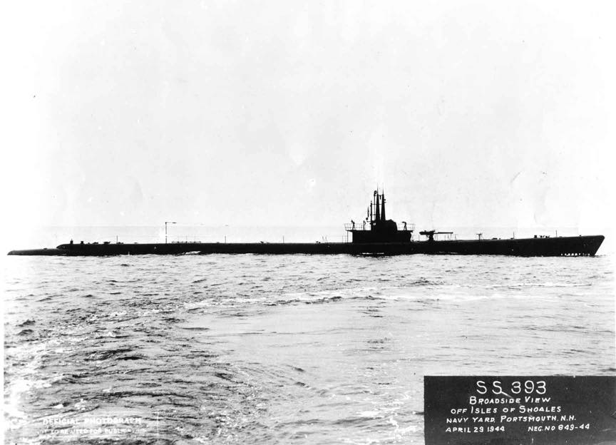 (SS-393: dp. 1,526 (surf.), 2,391 (subm.),1. 311'6", b. 27'3" dr. 15'3"; s. 20 k. (surf.) 9 k. (subm.); cpl. 66, a. 1 5", 1 40mm., ld 21" tt.; cl. Balao)